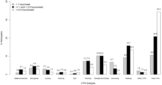 While it is recognized that PA accumulated in various domains (e.g., household activities, or active transport) is beneficial for health, the largest body of evidence exists for leisure time PA (LTPA) [1,7,8]. However, there also appear to be some important differences related to specific aspects of LTPA. For instance, there is evidence for the increased health benefits of vigorous compared to moderate-intensity activity, probably due to greater physiological adaptations and greater associated increases in cardiorespiratory fitness [4,9,10]. In addition, the type of LTPA performed may have implications for subsequent health benefits. Thus, in addition to achieving recommended levels of overall PA, guidelines now also recommend engagement in specific types of LTPA, such as strength, flexibility and neuromotor exercises. The American College of Sports Medicine for instance, summarizes the specific health benefits of these activities, such as improved bone mass and bone strength, reduced risk of falls and improved flexibility [4,11]. Although epidemiological studies have most commonly investigated the health effects of overall PA, overall sports participation, or walking [12,13,14,15], there is also some evidence supporting differences in health-related outcomes depending on the type of LTPA. For instance, the Health Professional’s Follow-Up Study indicated that especially running, strength training and rowing were associated with a lower risk of coronary heart disease, but other LTPA types were not [16]. A cohort study from China has also reported beneficial associations between jogging, walking and tai chi and mortality, but not with engagement in other LTPA types [17]. However, another cross-sectional study from China compared a larger spectrum of LTPA types and found potential benefits in relation to the metabolic syndrome for jogging, tai chi and dancing, but not for other LTPA types [18].
