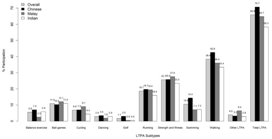 Overall, 65.8% of the sample reported to engage in LTPA (Figure 1 and Figure 2). The proportion of participants engaging in any LTPA was highest among Chinese (70.7%), followed by Malays (64.7%) and Indians (58.3%). Among these participants, 10.6% reported engaging less than 1 h on a weekly basis, while 20.8% spent between 1 and 2.5 h/week, and 34.4% spent more than 2.5 h/week in total LTPA. Walking, strength and fitness, and running were the three most commonly reported subtypes of LTPA, and this was consistent across all three ethnic groups (Figure 2). However, differences across ethnic groups were also noted. For instance, the highest prevalence of walking (42.6%), swimming (14.4%), balance exercises (7.0%), dancing (3.6%), and golf (3.0%) was reported by Chinese, while Malays reported the highest prevalence for strength and fitness (27.6%), ball games (12.1%), cycling (9.1%), and other LTPA (6.4%). The prevalence of running was almost identical for Chinese (19.7%) and Malays (19.4%). Indians did not report the highest prevalence for any LTPA subtype.