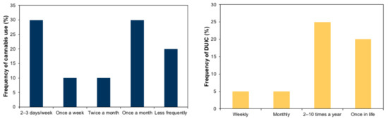 Self-reported frequency of cannabis use during the last six months (left) and self-reported frequency of DUIC (right) among the participants of the study.