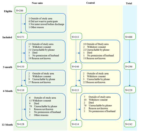 While maternal mortality ratios are declining globally, women increasingly experience life-threatening obstetric complications particularly in low and middle-income countries (LMICs) [1]. For every maternal death in LMICs, nearly 30 women survive a life-threatening obstetric complication; hereafter referred to as maternal near miss (MNM) [2]. Care for women after MNM usually ends at discharge from the hospital [3]; nevertheless, the consequences of MNM can be long lasting. The impact is usually multidimensional, affecting physical functioning, mental health, and socio-economical aspects [3,4]. So far, some studies researched long-term mental health consequences in women with MNM, such as depression and quality of life (QoL), but results are inconclusive [5,6,7,8,9,10,11,12,13]. For instance, most studies (e.g., conducted in Morocco [7], Benin [8], and Burkina Faso [9]) found that women with MNM had an increased risk of developing depression in the post-partum year, especially if they had lost their baby. On the contrary, similar studies in Malaysia [10] and England [5] found no significant difference regarding the risk of depression among women with and without MNM. Similarly, there is contradicting evidence regarding the association between hospital admission due to pregnancy complications and post-traumatic stress disorder (PTSD) [5,6,11]. This study aims to investigate mental health (depression and PTSD) and QoL of these women over time.