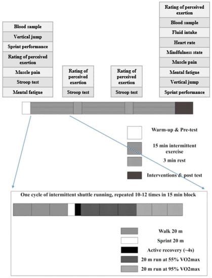 Participants’ blood samples in the pretest were collected after they arrived at the test field. Then they were instructed to complete a 10-min warm-up following a standard protocol as described in pretrial. Subsequently, the warm-up vertical jump, 20-m sprint, rating of perceived exertion (RPE), muscle pain, and mental fatigue were measured. During the break between two blocks, participants were asked to report their RPE level (i.e., second and third tests) and complete one Stroop test to induce mental fatigue.