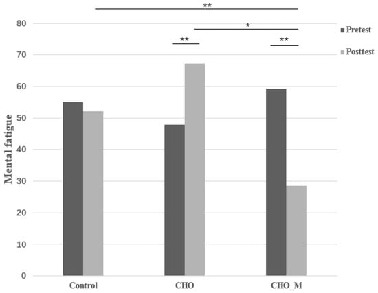 Regarding mental fatigue, a significant interactive effect was observed (p < 0.01, partial ŋ2 = 0.65). Post hoc analysis showed that there was a significant treatment effect in posttest (Control vs. CHO vs. CHO_M: 52.14 ± 7.43 vs. 67.14 ± 4.25 vs. 28.57 ± 6.10; p = 0.23 for Control vs. CHO; p = 0.05 for CHO vs. CHO_M and p < 0.01 for Control vs. CHO_M). A significant within group difference was also observed in both CHO (pre vs. post: 47.86 ± 23.92 vs. 67.14 ± 15.90, p < 0.01) and CHO_M groups (pre vs. post: 59.29 ± 15.92 vs. 28.57 ± 22.82, p < 0.01) but not in the control group (pre vs. post: 55.00 ± 14.01 vs. 52.14 ± 27.78, p = 0.68) (Figure 2).