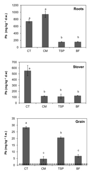 Lead concentrations were highest in roots and lowest in the maize grain (Figure 2). Application of TSP and BF decreased Pb concentration in roots by more than 75% with root Pb concentration averaging 156.2 and 157.1 mg kg−1 in TSP and BF treatments compared to 743.3 mg kg−1 in the control plot. Manure application on the other hand did not decrease root Pb concentrations and instead resulted in a slight increase. Unlike the concentrations of Pb in roots, all three soil amendments significantly (p < 0.01) reduced Pb concentrations in the maize stover from 554 mg kg−1 to below 130 mg kg−1, on average, representing a reduction of more than 75% (Figure 2). In the maize grain, Pb concentration decreased by 27%, 76% and 83% in the treatments TSP, BF and CM, respectively, compared to the control (Figure 2). The maize grain Pb concentrations ranged from 27.3–29.0, 3.1–5.3, 20.6–21.6 and 5.8–8.4 mg kg−1 in the un-amended control, CM, TSP and BF treatments, respectively. The Pb concentrations in the maize grain, from all treatments, were higher than the joint FAO/WHO maximum permissible limit of 0.2 mg kg−1 for human health safety.