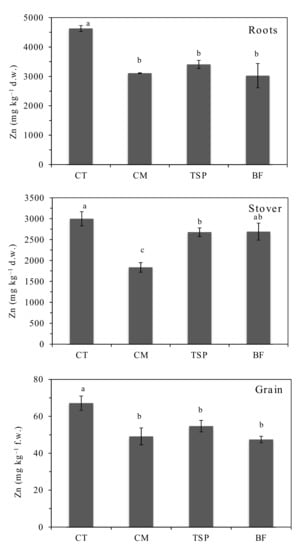 Zinc concentrations in different maize parts generally decreased with soil amendment application (Figure 3). In the roots, the Zn concentration in the amended soils ranged from 3100–3400 mg kg−1 compared to an average of over 4600 mg kg−1 in the un-amended soils, representing a 26–33% decrease (Figure 3). Chicken manure and TSP significantly (p < 0.01) decreased Zn concentration in the stover. A significant reduction of 18–29% in maize grain Zn concentration was observed in all three soil amendments compared to the control, but there was no significant difference among the three amendments. The maize grain Zn concentrations ranged from 62.4–71.9, 45.2–55.3, 50.9–58.5 and 45.7–49.9 mg kg−1 in the un-amended control, CM, TSP and BF treatments, respectively.