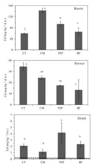 Concentrations of cadmium (Cd), in maize roots, stover and grain in plots amended with chicken manure (CM), triple superphosphate (TSP) and blended fertilizer (BF; a mixture of NPK and chicken manure). The horizontal broken line indicates the FAO/WHO maximum allowable limit of 0.1 mg Cd kg−1 maize grain for human health. Concentrations in roots and stover are on dry matter weight (d.w) basis, but on fresh weight (f.w) basis in grain. Bars with different letters are significantly different (p < 0.05).