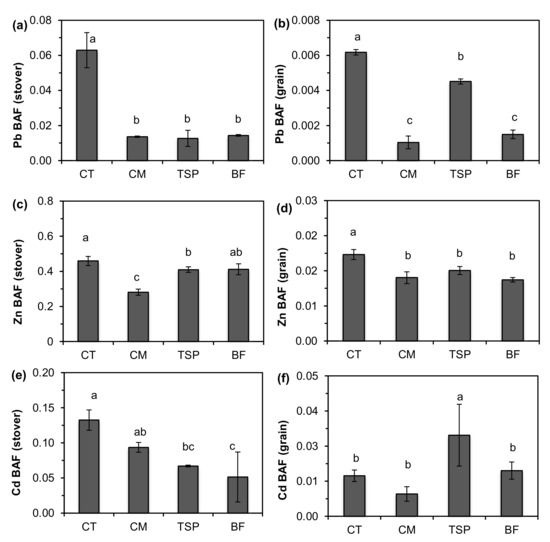 Bioaccumulation values for (a,b) Pb; (c,d) Zn; (e,f) Cd of maize stover and grain in plots amended with chicken manure (CM), triple superphosphate (TSP) and blended fertilizer (BF; a mixture of NPK fertilizer and chicken manure) and the control (CT). Bars with different letters are significantly different (p < 0.05).