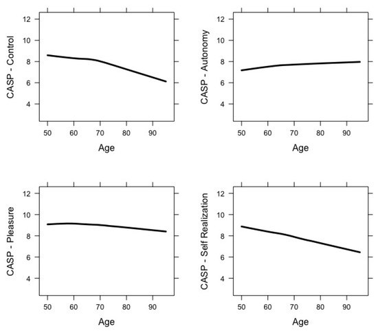 Previous research has largely demonstrated that quality of life tends to diminish with age, which is consistent with our findings. Nonetheless, such a change may not be linear, as several studies have reported that it tends to continue to increase through early old age before decreasing in later older age (e.g., [29,30]). This was, however, not the case in our study, where a small but constant drop was observed from approximately age 70 onwards. Although the importance of age itself has been highlighted in several studies (e.g., [31]), the association between age and quality of life is intricate, as several studies show that quality of life and its domains vary between individuals and groups (e.g., [32]), and that a wide diversity of associated variables must be taken into consideration (e.g., [30]). In our study, the observed constant drop in the overall score of quality of life may be associated with the instrument used here for assessing quality of life. When taking a closer look at the observed changes in the four domains of CASP-12 across age, two were found to clearly decrease with age (Control and Self-realization), whereas the Pleasure domain remained mostly constant with a slight decrease in very old ages, and the Autonomy domain somewhat increased. Previous data on the psychometric properties of the Portuguese version of this instrument have shown some inadequacies in terms of acceptability, internal consistency, and structural and construct validity, precisely in the Autonomy and Pleasure domains [23], echoing preceding concerns regarding the scale’s factorial structure and even the potential need for a revised shorter version of the scale [33]. As the use of the total score is preferred over individual domain scores, only cautious interpretations can be made as to whether and which specific quality of life domains are particularly affected over time. Bearing this important limitation in mind, what this study suggests is that one’s ability to be self-determined and the absence of unwanted interference from others (Autonomy domain) may not be as compromised across age as the other CASP-12 domains. Nevertheless, the aforementioned psychometric limitations of the scale lead us not to overvalue the age-related trends observed for the Autonomy domain.