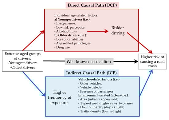 A general formulation of all previous causal associations regarding age-related increases in crash risk implies the a priori assumption of two causal paths linking age with a high risk of causing a road crash (Figure 1):