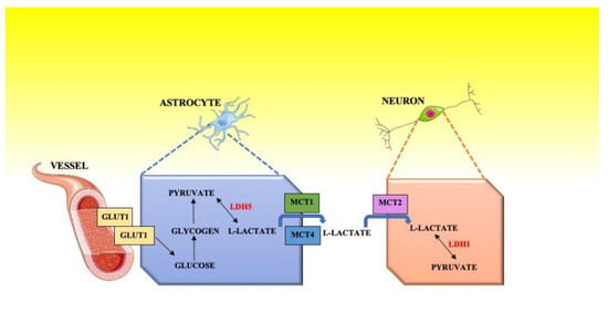 Since the 1920s, researchers have observed how lactate diffuses in the blood as well as how its concentration increases rapidly after exhaustive exercise [5]. Geers and Gros [6] demonstrated how blood transports lactate partly dissolved in the plasma and partly in the erythrocytes where it enters both actively and by simple diffusion. First, George A. Brooks [7] and then Pierre Magistretti and Luc Pellerin [8,9] have shown that the nerve tissue not only receives lactate from the blood but is also able to produce it at the level of the astrocytes. Once produced, lactate leaves astrocytes to go into neurons and is used as a useful metabolite; this process has been termed the lactate shuttle. Magistretti and Pellerin show in the theory of the “lactate shuttle” that the production of energy in the central nervous system (CNS) can be divided into two stages: anaerobic glycolysis and aerobic metabolism (Krebs cycle and oxidative phosphorylation); the first transformation process occurs in astrocytes, the second occurs in neurons [10]. Both transformation processes are regulated by the neurotransmitter glutamate, which is released by neurons and absorbed by astrocytes. Glutamate triggers the initiation of anaerobic glycolysis in astrocytes [10] and the production of lactate. The lactate produced is used as the main substrate during brain activation, as described by the astrocyte-neuronal lactate shuttle model (ANLS) proposed by Magistretti and Pellerin; this explains the lower consumption of glucose during stimulation [10]. In the mammalian CNS, and specifically inside the astrocytes, the chemical process takes place that transform glucose into pyruvate, this process is guaranteed by the presence of the enzyme lactate dehydrogenase 5 (LDH5) which catalyzes the conversion of lactate into pyruvate and the reverse reaction [10]. (Figure 1) [9,10].