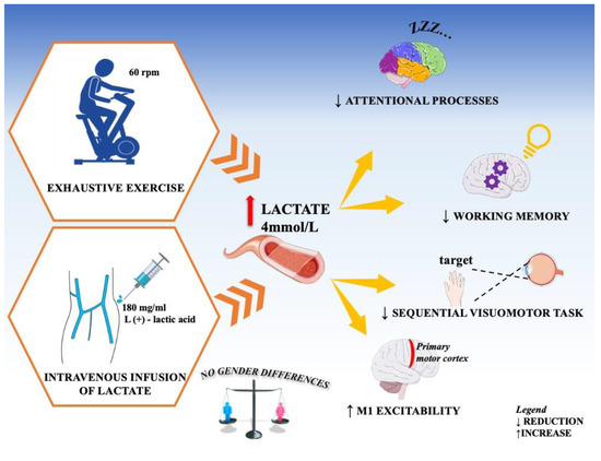As a result, over the past ten years, numerous studies were carried out with the purpose of evaluating whether an increase of blood lactate is able to modify brain functions in humans by acting as a neuromodulator. Below, we briefly review the literature on the relationship between blood lactate levels and cognition as well as the effects of high lactate levels on cortical excitability. Overall findings are summarized in Figure 2.