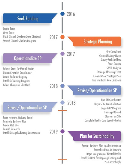 The goal of COEs is to develop specialized skills in an area of practice in order to improve outcomes for patients [12]. To develop this COE, the GWC team first developed a mission and vision statement and identified six essential objectives, or prongs, for their center including the provision of trans-specific (1) medical care, (2) surgical care, (3) mental healthcare, (4) community-based research, (5) legal services, and (6) training and education. The team then participated in a three-part strategic planning retreat led by an external facilitator. The facilitator was a professional strategic planning consultant with a Master’s of Social Work degree. The strategic planning process included three 1–2-day, off-site retreats attended by three GWC medical providers, a case worker, three mental health providers, and the professional consultant. The initial session focused on brainstorming steps required for development and implementation of the Center of Excellence. Five strategic initiatives were agreed upon. Specific tasks related to these initiatives were identified and assigned to team members. Follow-up retreats, supplemented by monthly team meetings, were scheduled to monitor task completion. Figure 1 highlights the five arms of the strategic plan and key activities within each, while Figure 2 shows the grant timeline, including two time points relevant to this study.