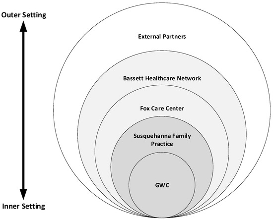 Depiction of the structure within which the GWC is embedded. For the purposes of this study, the GWC and Susquehanna Family Practice (dark grey) were considered the inner-most setting, with Fox Care Center and the Bassett Healthcare Network (light grey) displaying qualities of both the inner and outer settings, and partners external to Bassett Healthcare Network (white) in the outer-most setting.