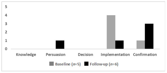 Individual stage of change: At baseline, four of the five participants reported being in the implementation stage, with one reporting being in the confirmation stage (Figure 4). At follow-up, most participants (four of six) reported being in the confirmation stage, with one participant each in the implementation and persuasion stages (Figure 4).
