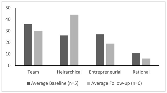 Within the GWC itself, measures of the type of workplace culture most actively present changed over time, with the primary culture shifting from a mixture of team and entrepreneurial at the baseline to hierarchical at follow-up (Figure 5). In addition, at both baseline and follow-up, participants described relatively high amounts of conflict and negativity within the GWC but outside of the core implementation team. At baseline, there was a great deal of discussion about GWC and family practice staff feeling out of touch with the COE implementation and, therefore, without support. At follow-up, these concerns had improved.