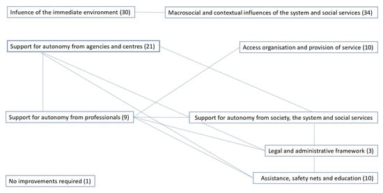 From a more detailed perspective, regarding the professionals’ suggestions for young people’s time management and use in terms of the influence exerted on a macrosocial level and by the system and social services, more opinions were forthcoming on those improvement actions of a general nature for supporting autonomy from society, the system and social services (11, 32.4%), followed by those improvements in terms of care, safety nets and education (10, 29.4%), as well as those focusing on the access to, organisation and provision of services (10, 29.4%) and, finally, suggestions for improving the young people’s legal and administrative framework (3, 8.8%).
