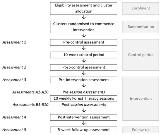 Assessment timepoints include pre- and post-control period (assessments 1 and 2), pre- and post-intervention (assessments 3 and 4), and 5-weeks post intervention (assessment 5). Additional timepoints include pre (assessments A1–A10) and post (assessments B1–B10) all FT sessions. A flow diagram of study phases and assessment timepoints can be seen in Figure 1, below.