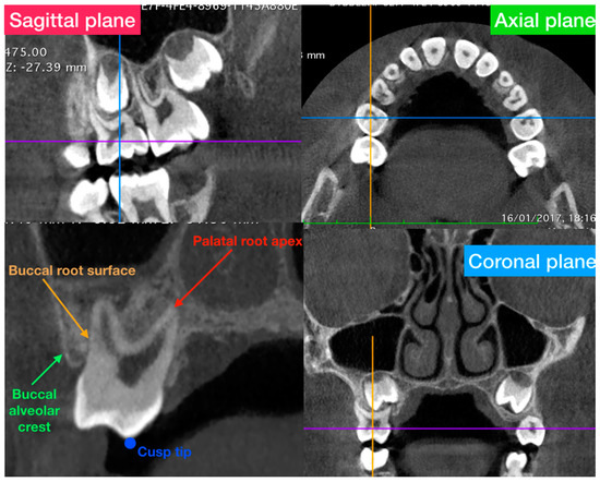 Axial-guided navigation (AGN) was used to locate landmarks [31] by moving the axial cursor on the sagittal or coronal multiplane reconstructions guided by the axial plane along the axis of the dental root to achieve an optimal visualization of the crown, root, and marginal alveolar bone in the chosen view.