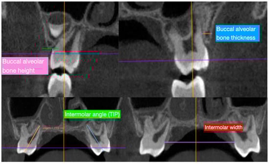 - Buccal alveolar bone thickness (BT), defined as the distance between the buccal root surface and the outer border of the alveolar bone, along a horizontal line passing through the furcation;