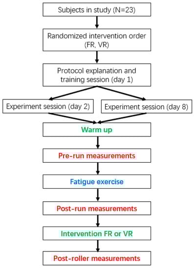 After completing postrun measurements, participants performed 6 min of VR or FR, which was randomized for recovery intervention and SBF measurement (postroller). The participants had a one-week interval to recover from muscle fatigue between crossover experiments.