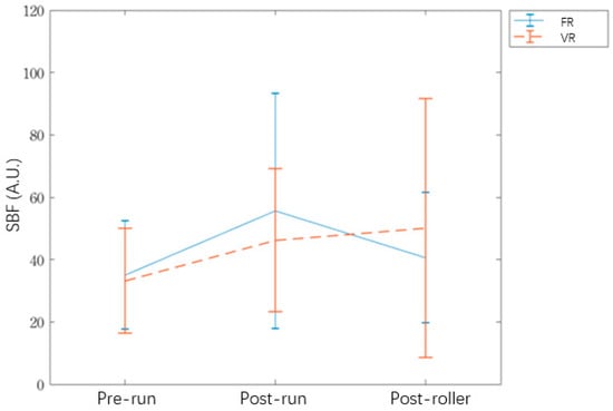 After using VR, SBF perfusion was higher for the VR group than the FR group. There were larger individual differences in the SBF perfusion, so the difference between the two types of rollers was not significant. The ANOVA analysis shows a significant time effect (p < 0.001). The posthoc test results show a significant increase between prerun and postrun measurements for the FR group (Table 4).