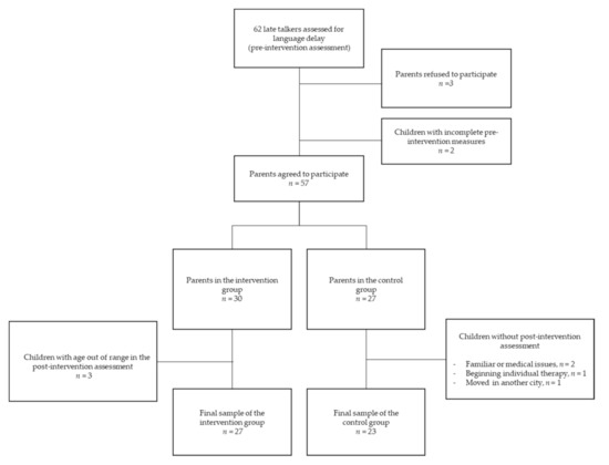 - Buschmann, A.; Jooss, B.; Rupp, A.; Feldhusen, F.; Pietz, J.; Philippi, H. Parent based language intervention for 2-year-old children with specific expressive language delay: A randomised controlled trial. Arch. Dis. Child. 2009, 94, 110–116. [Google Scholar] [CrossRef]