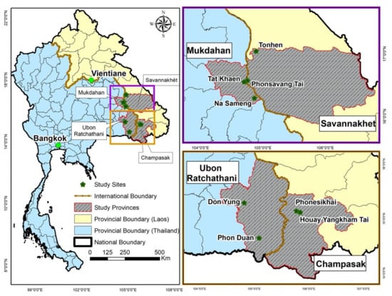 This study was part of a larger project on dengue risk factors, vulnerability, and climate conducted in representative urban and rural areas near or along the Mekong River in Mukdahan and Ubon Ratchathani provinces in northeastern Thailand and in Savannakhet and Champasak provinces in southern Laos (Figure 1).