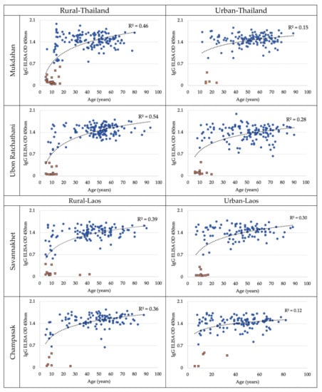 Distribution of dengue IgG enzyme-linked immunosorbent assay (ELISA) optical density (OD) values by age (blue dots denote the OD seropositive and orange dots denote the OD seronegative individuals) in urban and rural of Thailand (upper panels) and in Laos (lower panels) in May 2019. Shown is a logarithmic tendency curve.