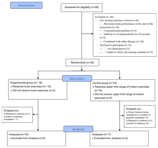 Ninety-eight persons in the subacute stage of stroke were contacted between August 2018 and October 2019. A total of 38 participants fulfilled the eligibility criteria. After completing the baseline assessment, the participants were randomly allocated into either the control (CON, n = 19) or experimental (EXP, n = 19) group. Randomization was conducted by using a computer randomization program. The randomization schedule was concealed to the assessor.