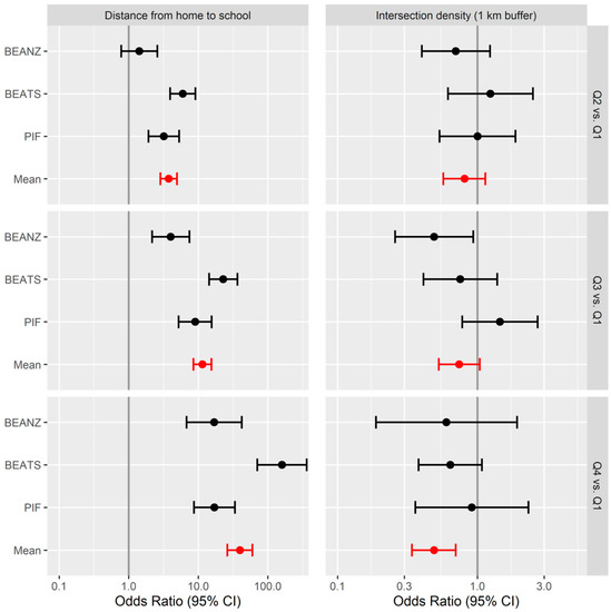 Forest plot comparing quartile 1 with quartiles 2, 3, and 4 for distance to school and home neighbourhood intersection density (1 km buffer) associations with car travel to school. BEANZ = Built Environment and Adolescent New Zealanders Study; BEATS = Built Environment and Active Transport to School Study; PIF = Pacific Islands Families Study; Q = quartile. Note: Due to small sample size, data from URBAN Study are not presented here.