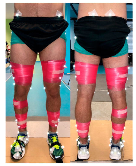 Overground walking, running and treadmill running trials are completed in a counter-balanced order dependent on the number of participants during particular testing day. Subsequently, a cutting maneuver are performed. Reflective calibration and tracking markers are positioned on the pelvis bilaterally on the posterior superior iliac spines, and the anterior superior iliac spines. Markers are also positioned bilaterally on the lower limb on the medial and lateral malleoli, the medial and lateral femoral condyles, the greater trochanter of the femur and on four light-weight rigid plates with four markers per plate on the thigh and shank [35]. Markers are used to define the multi-segmental Rizzoli foot model on the right foot [36,37]. On the left foot rigid body model, a triad on the heel and markers on the first and fifth metatarsal heads are placed. Markers are attached on standard laboratory neutral running shoes (Brooks Launch 5, Brooks Sport Inc., Seattle, WA, USA). Delsys EMG sensors are placed over skin on the following muscles: rectus femoris, biceps femoris, gluteus medialis, and tibialis anterior (Figure 2). Prior to the biomechanics measurements, a standing calibration trial is recorded followed by a half-squat for EMG calibration.