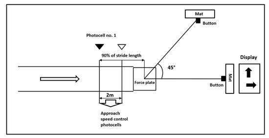 Lastly, an unanticipated cutting maneuver is evaluated. For easy identification of the direction, a reflective tape is attached to the floor at an angle of 45° to the left side. A maximal approach speed is controlled using two photocells. For the unanticipated sidestepping task, photocell number 1 triggers a visual display to indicate if the participant will conduct a sidestep cut or proceed straight ahead. Photocell number 1 is placed at a calculated distance from the center of the force plate (90% of stride length plus an added distance for correction for the timekeeping signal delay based on the approach speed—0.2 s) (Figure 3). Participants are required to perform five successful running trials and five cutting unanticipated trials at the maximal self-preferred speed and then touch the mat at the end of the track as quickly as possible. Five successful cutting trials are collected after unanticipated trials presented in random order.