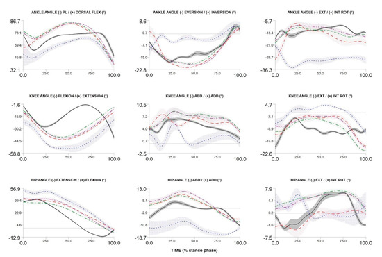The patterns of kinematics, kinetics and electromyographic activity during walking, running and cutting maneuvers allow a comprehensive description of possible biomechanical loads during locomotion and change of direction. The measured curves are in accordance with the results presented in previous studies [54,66,67,68,69]. In addition, the ranges and maxima of angles, moments, and EMG are in accordance with the intensity of individual movement tasks (walking lowest intensity, running medium intensity, and cutting maximum intensity). Discrete biomechanical variables derived from the presented curves (e.g., initial contact angles, maximum moment values, net joint powers, coordination variability, etc.) can be used in multidimensional statistical models to identify factors affecting musculoskeletal injuries.