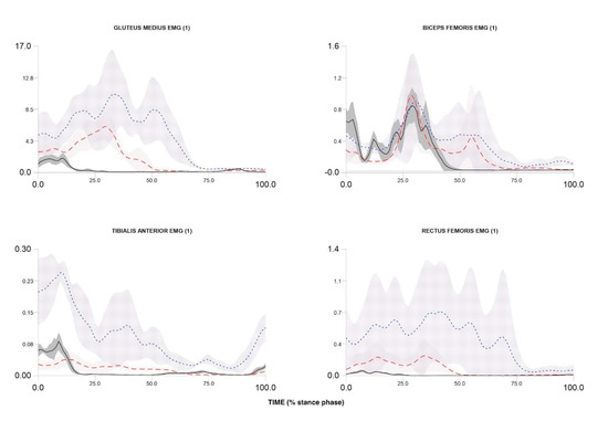 Electromyography activity during stance phase of walking, over-ground running and cutting maneuver in one participant. Over-ground running—red dash line; walking—black solid line; cutting maneuver—blue dot line.