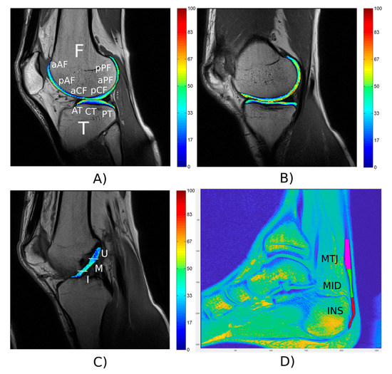 Representative T2 relaxation time map of knee articular cartilage and regions-of-interest (ROIs) for the lateral (A) and medial compartment (B); F—femur, aAF—anterior side of anterior part of femur, pAF—posterior side of anterior part of femur, aCF—anterior side of central part of femur, pCF—posterior side of central part of femur, aPF—anterior side of posterior part of femur, pPF—posterior side of posterior part of femur, T—tibia, AT—anterior part of tibia, CT—central part of tibia, PT—posterior part of tibia. Representative T2 relaxation time map and ROIs of ACL (C); Whole ACL, I—insertion, M—mid part, U—upper part). ROIs of AT on sagittal T2*-weighted image (D); INS—insertion, MID—middle, MTJ—muscle-tendon junction.