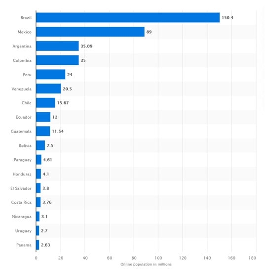 - Statista. Internet Users as Share of the Total Population in Countries in Latin America and the Caribbean as of January 2020. Available online: https://www.statista.com/statistics/186919/number-of-internet-users-in-latin-american-countries (accessed on 15 October 2020).