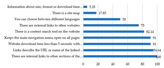 Particularly striking is the high score of the links, 94.64% of the sample which apply a wording adapted to screen reading, allowing Internet users to know the type of website they will be accessing. In addition to this, in both cases with a percentage of 91%, the speed of downloading the contents of the websites, on the one hand, and on the other, the feature that keeps the navigation menu open while the user navigates the page. The presence of the search engine tool (with a percentage of 82.14) is also high, as well as the use of external hyperlinks with a 75% of the sample that connect to other pages and allow for more information. The most critical aspects refer to the scarce number of websites only the half of the sample (50%) that offer a multilingual platform and, on the other hand, only 17.87% of the hospitals studied present a site map which is essential for navigation. The most worrying aspect is that 5.35% of the hospitals analyzed provide information regarding the size, format or download time of the documents they offer on their websites.