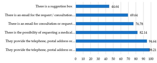 Regarding to the second study variable, “Interactivity and interactions” with the visitors to their pages, the study shows (as shown in Figure 3) that practically all the hospitals studied provide basic contact data (including telephone, fax and postal address). The figure is slightly lower in relation to the presence of the specific contact data of the different areas or services. However, in both cases, it is possible to state that the websites provide complete information on this basic information. A total of 82.14% of the hospitals studied offer the possibility of making medical appointments through their respective pages and, in this same line, a large number, 76.78% present a general space for consultation through an e-mail or a basic information form. This same service is also offered in 69.64% of the sample with the specific e-mails of each unit, specialist or subarea. The weakest point refers to the existence of a suggestion box which is only present in less than half, 44.64% of the selected hospitals.