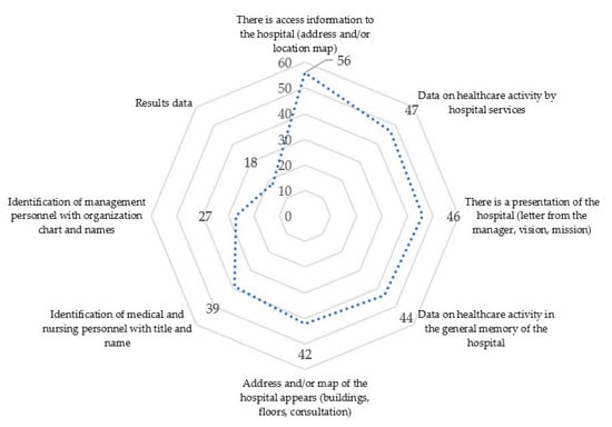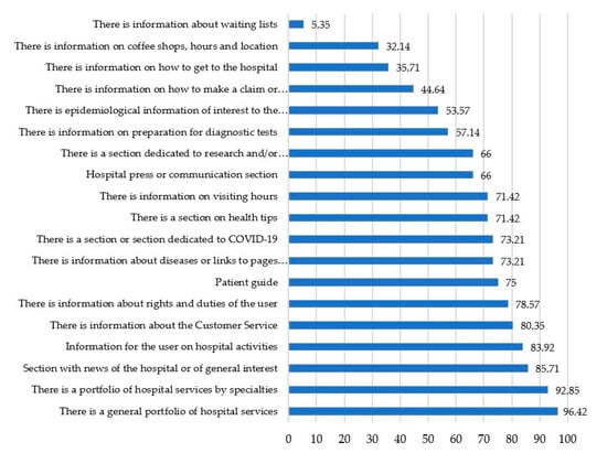 With regard to the information provided on the websites, related to the third variable studied, a 100% of hospitals offer basic information about the center and 83.92% also offer information about their specific services as shown in Figure 4. The large number of cases is noteworthy. A percentage of 82.14 of centers analyzed, they include a welcome message, a letter of introduction or a message focused on transmitting the mission and vision of the center. In this case, it is usually the manager or the general director of the hospital. Of the total, 78.57% of the hospitals offer data on the general activity of the center in an annual report or summary report; while 75% rely on content in the form of a map to describe and convey the characteristics and services of the center.