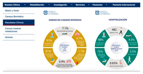 The number of medical centers that identify their staff by title and name is 69.64%; while only 48.21% of the sites analyzed provide information on the organization chart of management positions and their functions in the hospital. The study identifies that there is no habit of providing information with data and percentages relating to the number of care operations, interventions or surgeries carried out. There are, however, some exceptions such as the “Clínica Universidad de la Sabana” (Colombia) which does offer infographics and content related to the so-called data content or data journalism as can be seen in Figure 5.