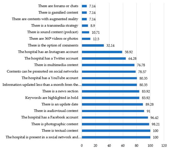 Low prominence of contents related to the most current trends (as seen in Figure 8) is one of the most significant results of the study. In this sense, the presence of gamified contents, augmented reality contents, contents with immersive video or photographic or video 360° contents or podcasts are practically non-existent. In general, less than a dozen of the hospitals analyzed present some content of this type. In addition, chats and forums have lost their importance as spaces for dialogue and only appear in four of the centers analyzed. The bet of contents based on the playful logic of games appears in 32.14% of the websites; while augmented reality (7.14%), podcast (10.71%) and immersive photographs and videos (12.5%) is equally scarce. Furthermore, only 8.9% of the hospitals analyzed show a transmedia strategy, which is related to information offered in different digital platforms, designed within a wider digital ecosystem.