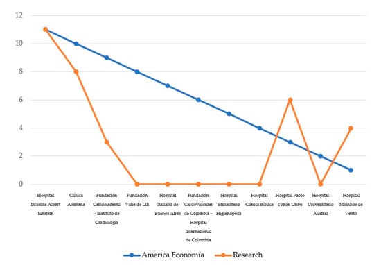 According to all data analyzed, a whole of 65 indicators related to six different variables of study, it is expected that the sample studied, which represents the best hospitals in the ranking “America Economía Ranking” have obtained best results in terms of communication and digital strategy from the studied addressed. However, if we compared the results from our study with results published in the ranking, where the best hospitals have been selected for our sample, it can be observed surprising results showing that best hospitals in the ranking in terms of medical services, are not the best hospitals in terms of digital communication strategies. In this regard, as can be seen in Figure 9, the “Albert Einstein Israeli Hospital” in Brazil stands out for occupying the first position in both directories and, therefore, is consolidated as one of the best centers in both dimensions: medical and web communication. Along with this center, only the “Clínica Alemana” in Chile remains among the top positions in both rankings. Specifically, it occupies second place in the list of “América Economía Ranking” and fourth in the one derived from this study. Furthermore, it is very interesting that hospitals such as “Marcelino Chapagnat” in Brazil, which is in 46th place in the “América Economía ranking”, was the second hospital with the best website in all of Latin America. This data shows, therefore, that there is no correlation between the quality of the medical services offered by the hospitals and the quality of their digital communication through their website. This evidence is confirmed by the cases of “Hospital Marcelino Chapagnat” in Brazil, which is ranked second with the best communication on its website, but 46th in the directory prepared with “América Economía”; while in the case of “Hospital General de Medellín Luz Castro Gutiérrez”, which is third with the best website, it is 33th in the ranking on medical services.