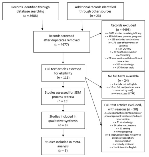 As we considered the aspect of “taking a decision” at least reflected in the resulting vaccination rates, the present work focused on the decision process in interventions [32]. In many definitions of SDM there are aspects even before “information” and “deliberation”, representing some kind of patient activation (e.g., “two participants are involved” [26], “announcement, that there is a decision to be made” [25,33] or “encouragement to talk” [31]). Consequently, in this review three aspects characterize a SDM process that must be included in the interventions for studies to be eligible.