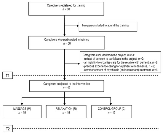 This study was screening in nature, thus the findings obtained are not equal to a medical diagnosis. One of the limitations of this project was the relatively small group of respondents, with poor representation of male caregivers and those individuals who did not receive assistance. Another serious problem was the lack of objective (research-based) knowledge about the psychophysical condition of the dementia sufferers, which is of great importance in terms of the amount of effort that needs to be put into the care of the patient. Nonetheless, caregivers do not usually compare their patients to other people with similar problems or subjectively experience the difficulties involved in caring for others because they are not familiar with their situation. Future research should be expanded to include the somatic condition of the caregivers and the ways in which they spend their free time. It is also worth extending the panel of psychometric tests to include tools to assess the level of caregivers’ anxiety and stress, as well as to determine the best methods to deal with stress. It would also be valuable to measure stress biomarkers before and after the therapeutic intervention. These studies should be continued, ideally taking into account the above remarks, on a larger number of respondents to identify measures that will most effectively support caregivers in their future care of a suffering family member. Furthermore, we have no knowledge of how long the effects of the nonpharmacological forms of therapy (massage and relaxation) last after being provided. Moreover, for the purposes of this scientific project, the selection of the groups was random, thus. the intervention may not have been the most suitable for a given person. It is possible that the caregiver themselves should be the one to choose the form of support from several proposals that are available, adjusting their choice to their own abilities and preferences.