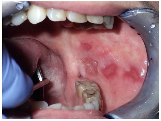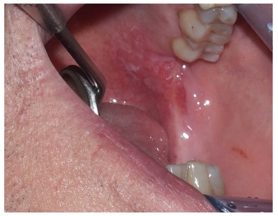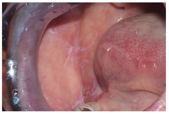 Lichen planus is a chronic inflammatory disease immunologically driven that usually affects middle-aged patients [], particularly women aged 30 to 60 []. It usually affects the skin, but can also have mucosal involvement, including the oral mucosa (oral lichen planus—OLP) []. Oral lichen planus is mostly a chronic disease, whereas the cutaneous form may remit within 6 to 12 months []. OLP can manifest in different ways and the subtypes can be classified as reticular (the most common type, characterized by Wickham striae and hyperkeratotic plaques or papules), papular, plaque, atrophic, erosive with areas of ulceration associated with keratotic white striae, and bullous, with bullae that can rupture and lead to ulceration [,]. The plaque subtype of oral lichen planus can resemble leukoplakia in appearance, which underlines the importance of biopsy []. OLP most commonly affects the buccal mucosa, followed by the gingiva and tongue; patients usually show multiple, bilateral lesions []. Erosive and atrophic OLP can cause severe pain and interfere with speech and swallowing [] (Figure 3). It is still debated whether oral lichen planus can transform into oral squamous cell carcinoma [], with reported transformation rates ranging between 0% and 12.5%: There are no clinical or histopathological characteristics that can help predict possible malignant transformation []. The erosive OLP carries the highest risk of malignant transformation, followed by atrophic OLP, while reticular OLP carries the lowest risk []. As for leukoplakia, cancers can arise in different areas of the oral cavity, and not strictly associated to the OLP lesions [].