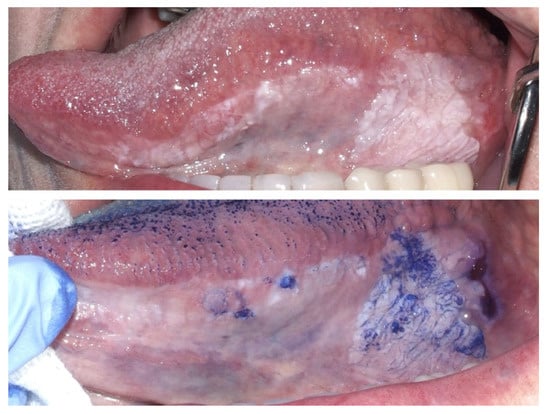 Its application is very easy and fast: a 1% aqueous solution is applied for 30 s on the area of the suspect lesion, after the application of 1% acetic acid to remove salivary and bacterial pellicle; the staining pattern is then evaluated [] (Figure 7).