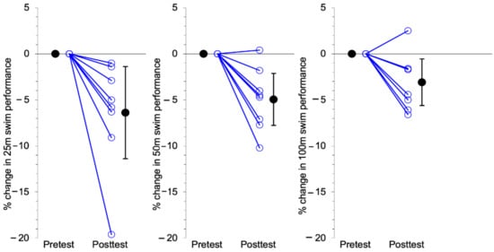 Individual (open blue circles) and mean (solid black circles with 95% Confidence Intervals) improvements in swimming performance times from pre- to post-training for 25 m, 50 m and 100 m freestyle sprints.