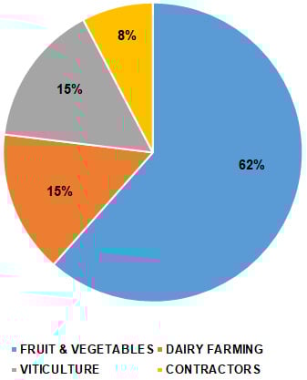 In addition, background information is also requested in the questionnaire, concerning age, gender, and position within the company (i.e., workers and managers). The interviews in this study were carried out by self-administered questionnaires to 49 companies involved in agricultural activities in the Italian region of Lazio, which accounts for about 5000 companies in the agriculture sector. A farmers’ union provided us with a list of the companies we asked to collaborate with: among them, 35 companies responded positively (71% of the contacted companies) and a total number of 108 responses, including both managers and workers, was collected. It has to be noted that all the companies are small-sized or family-run enterprises, whose specific activities range from fruit and vegetables cultivation to viticulture and dairy farming (Figure 1).