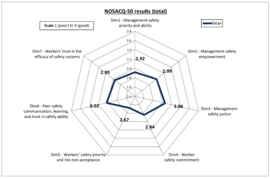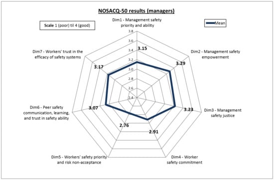 NOSACQ-50 was presented by Kines et al. [] in 2011 as the result of research activities involving a Nordic network of occupational safety researchers and it was available online []. The reliability and validity of NOSACQ-50 has been tested in various studies in different contexts, confirming its effectiveness as a diagnostic tool to investigate the safety climate within organizations [,,]. The questionnaire consists of 50 statements, which contribute to evaluate seven SC dimensions. In detail, the aggregation of the statements for each dimension is provided as follows: