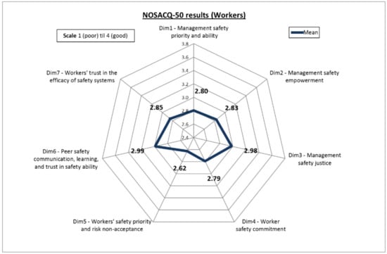 - Dim6—Safety communication, learning, and trust in co-workers safety competence: 8 statements investigating how workers perceive the exchange of safety knowledge and experiences among themselves.