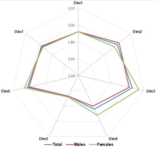 Another interesting result is related to the discrepancies that emerged between males and females: as shown in Figure 5, they concern both the general trend of the SC perception (compared to the overall pattern) and the differences in score related to specific SC dimensions.